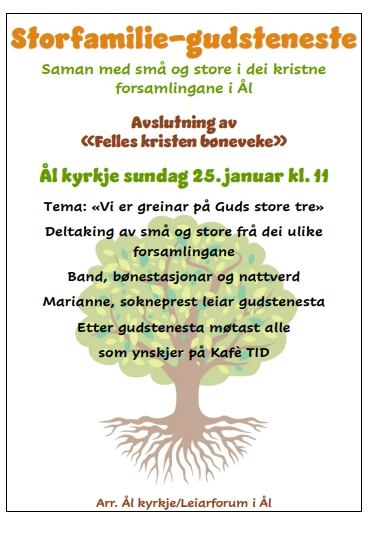 Bli med på avslutninga av Felles kristen bøneveke i Ål kyrkje sundag 25. januar.